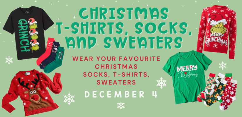 Dec. 4: Xmas T-Shirt/Sweater & Sock Dress Up Day