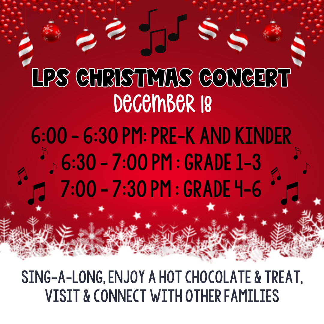 Our students and staff have been very busy preparing for the upcoming Christmas Concert-Sing-a-long evening. We look forward to seeing as many of our LPS families as possible at our event. We are tweaking the format a little bit to make our evening more of a family engagement evening. We have staggered and separated the grades into three groups to allow us to be less crowded in the gym.